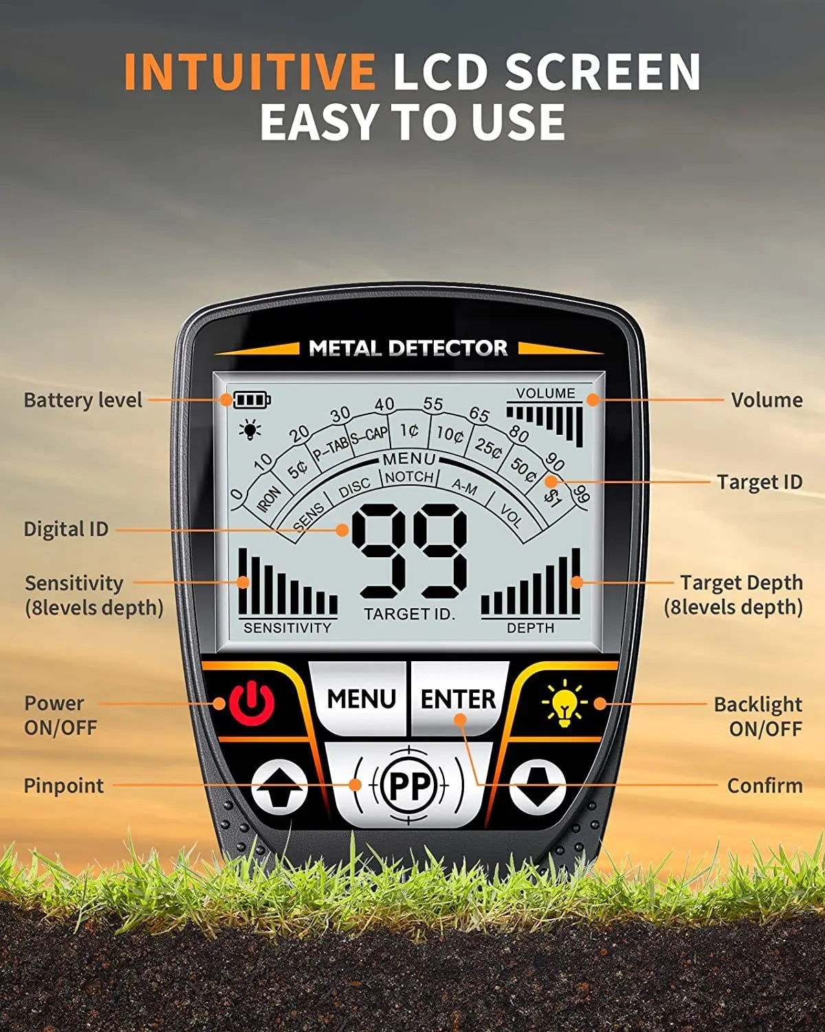 INTUITIVE LCD DISPLAY: Equipped with an LCD in the detection process will show the mode, results, volume, depth, sensitivity, and other information. In addition, the LCD has a backlight function, even when detecting at night, just press the backlight button to see the information on the screen.