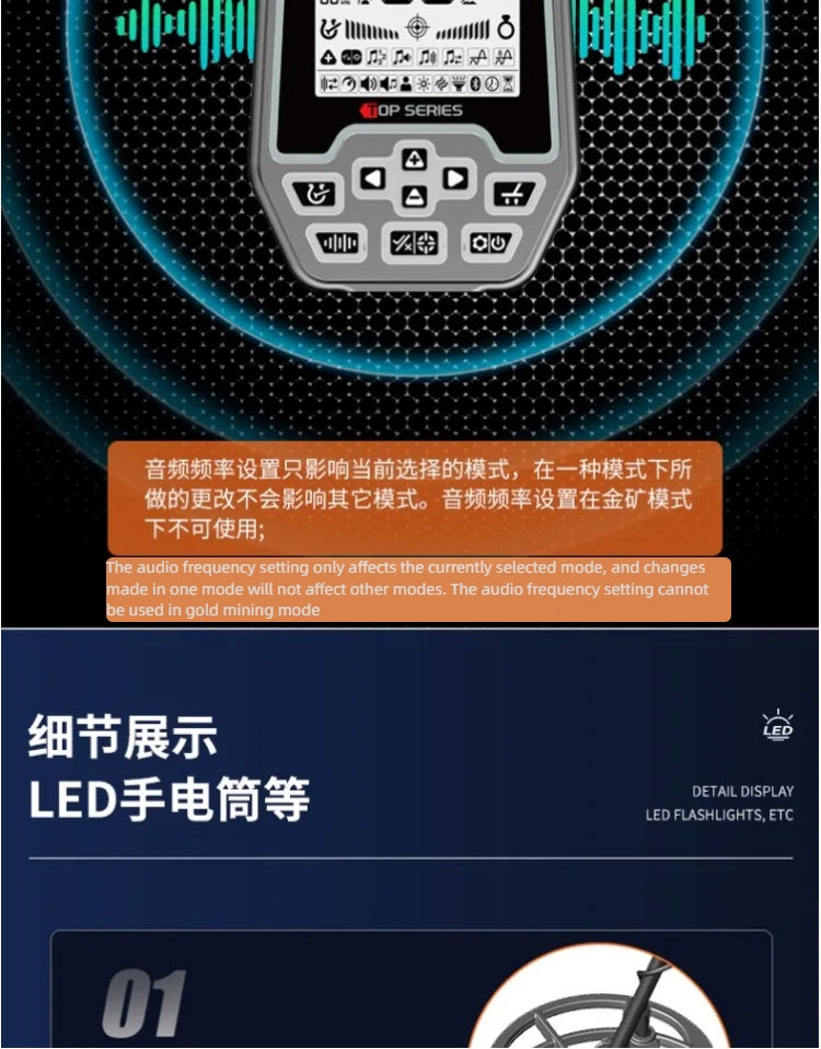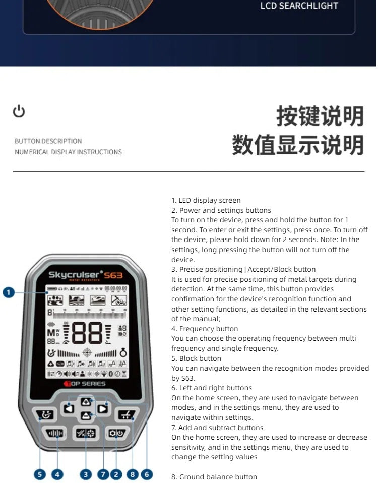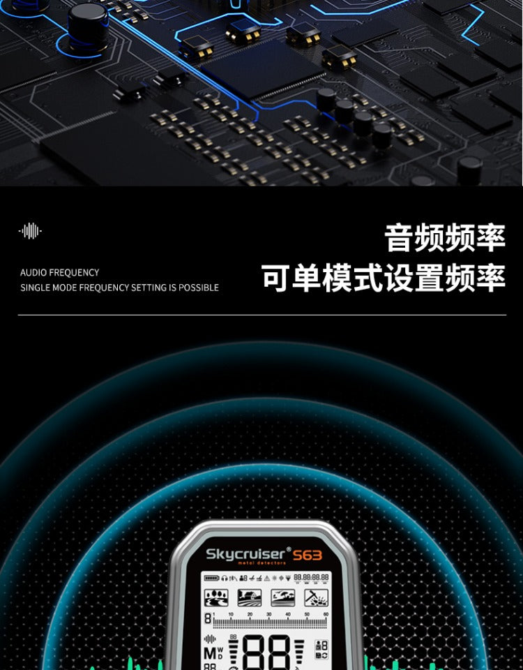 The S63 underground gold detector and treasure hunting instrument is a new high-sensitivity underground metal detector. It can detect particulate gold and natural dog-headed gold underwater. Sand gold detector has high sensitivity and can clearly detect more than a few grams of gold, making it easier to detect metal objects. The S63 gold detector has multiple frequency channels and comes with a one-click frequency sweep function. It can intelligently detect the environment, reduce ground noise and reduce saline-alkali soil interference. It has unique audio gain, amplifies subtle signals, avoids target omissions, and uniquely provides target metal The ratio of iron and non-iron can better identify the target metal type. The maximum detection depth of the instrument can reach 3 to 5 meters, and the waterproof level can reach 5 meters deep.